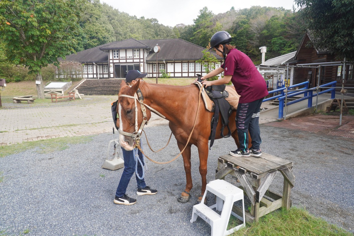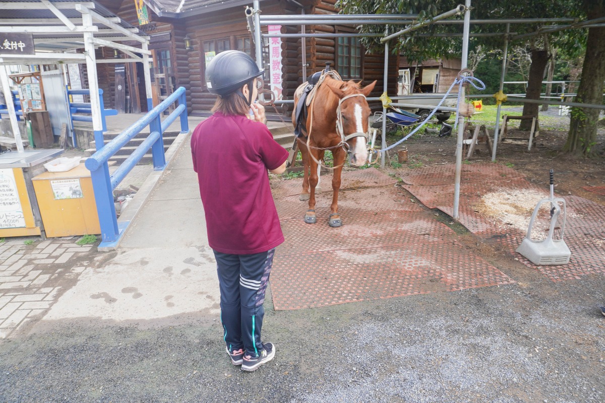 にんにんホーススクールの施設で受付を済ませるとヘルメットを装着して、すぐに乗馬スタートです!
