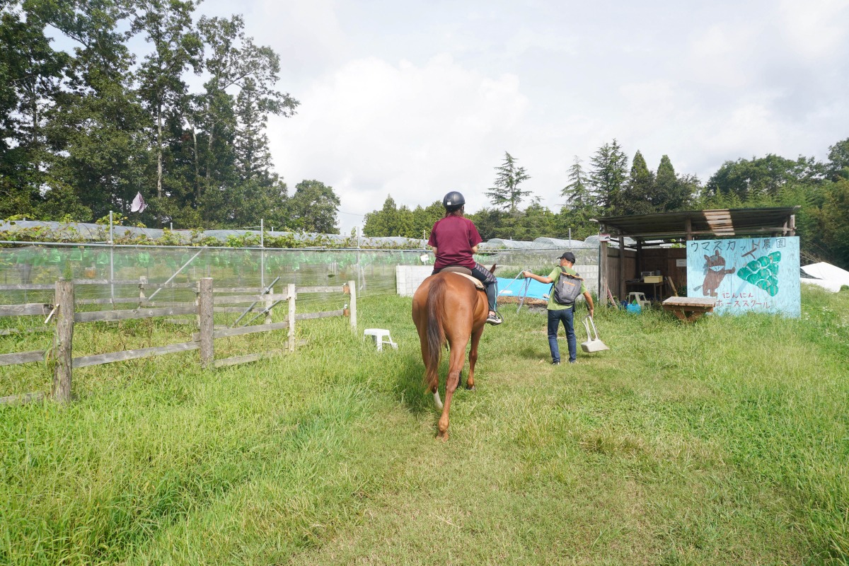 にんにんホーススクールでは、ぶどうトレッキング以外にもひき馬体験や乗馬体験等のプログラムやライセンス取得を目指す乗馬教室も行われています。