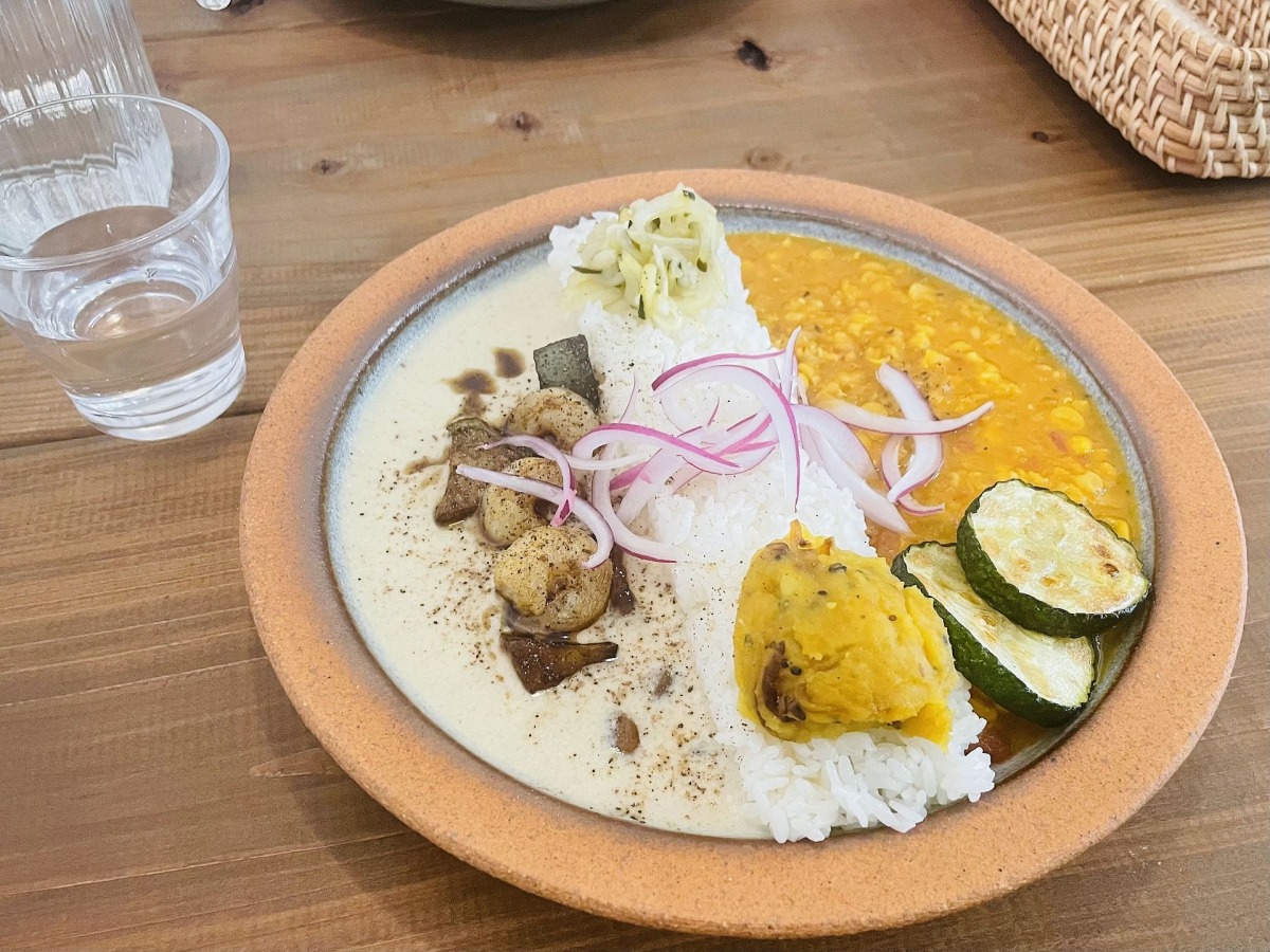 カレーは海老と茄子のグリーンカレーとひよこ豆とレンズ豆のダルカレーのあいがけをチョイス。どちらも美味しかったです。カレーは他のスパイスカレー屋さんより辛さ控えめなので辛いのが苦手な方にはお勧めです。