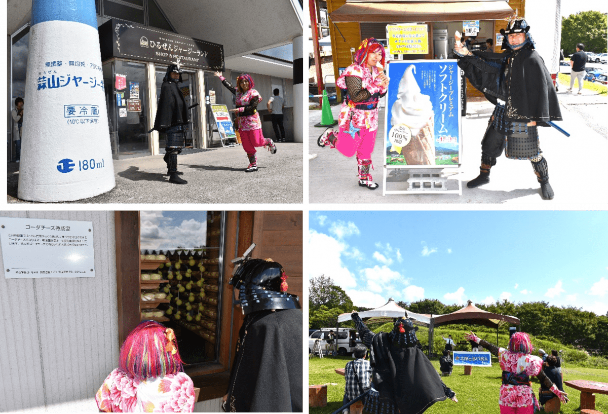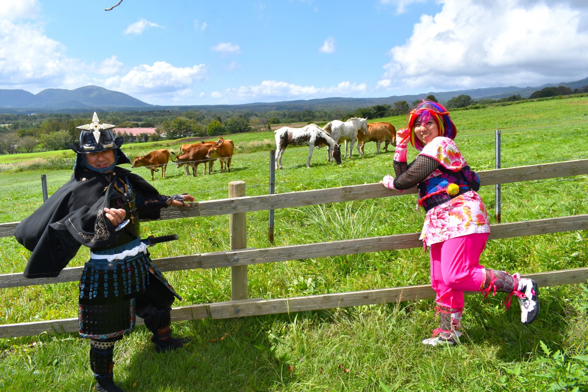 その他にレストラン、ストアもあり、濃厚なジャージー牛乳を使った料理や乳製品などを味わったり、お土産に購入できるのじゃ。山側の放牧場に向かうと映えるフォトスポットもたくさんある。牛や馬の放牧は10月下旬頃まであるそうじゃ。ちょうど野外イベントステージでは岡山のタレント・ラジオパーソナリティーの栢野紗奈ちゃんのコンサートをやっていて楽しい時間も過ごさせていただきもうした。