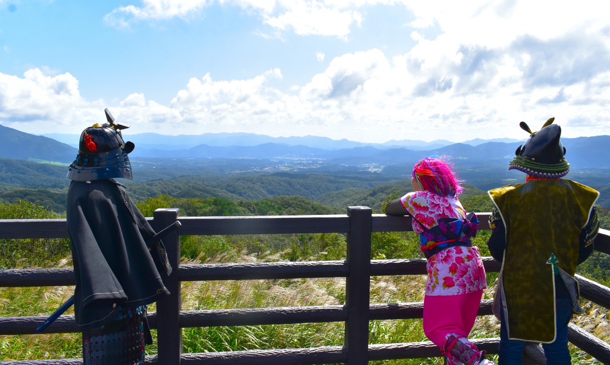 この福王寺と、初秋の蒜山の人気スポットを岡山戦国武将隊の明石全登と戸川秀安、そして作州忍者隊のともちピンクがご案内いたしまする。