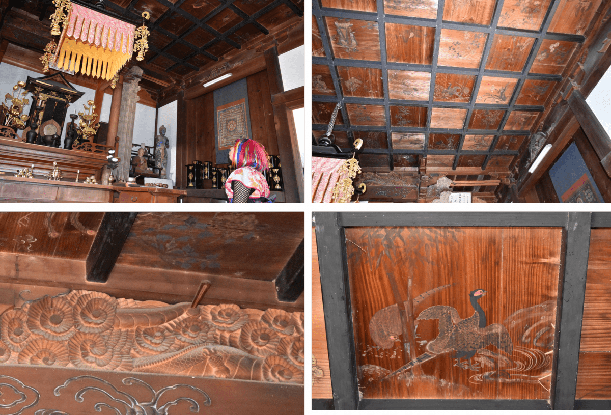 江戸時代の寛政8年(1798)落慶された旧本堂内には薬草曼荼羅の天井絵が残されておる。そして、龍が彫られた欄間があるのじゃが、よく見ると龍の尾に杭が打たれておるんじゃ。これは、水害はこの龍が暴れて起きると当時の人は考え、雨ごいや水害対策のためこの龍の尾に杭を抜いたり刺したりしたと伝わっておるそうじゃ。