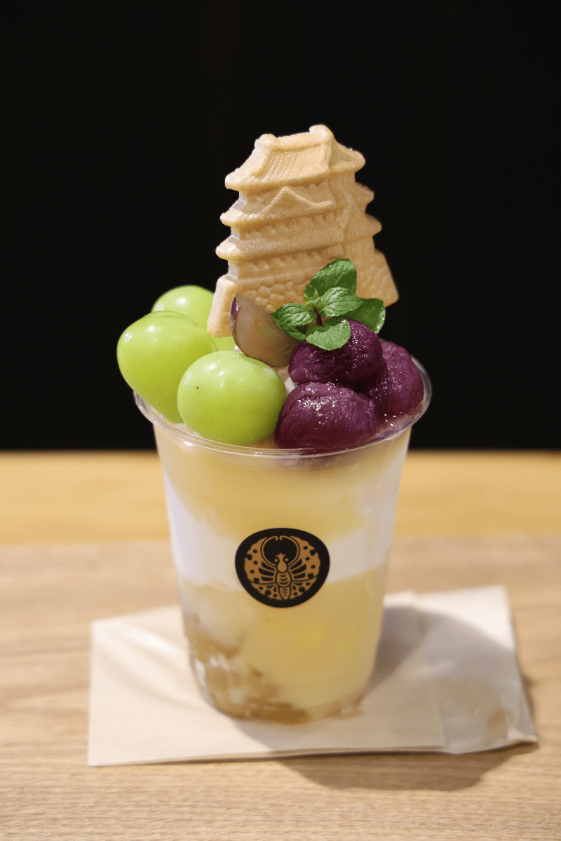 この日は暑くて、着付けからのセルフ撮影を2ラウンドしたら甘いものが食べたくなり、同じフロアにある「烏城カフェ」で、気になっていたお城パフェ(シャインマスカット、税込み1,500円)を頂くことにしました。
