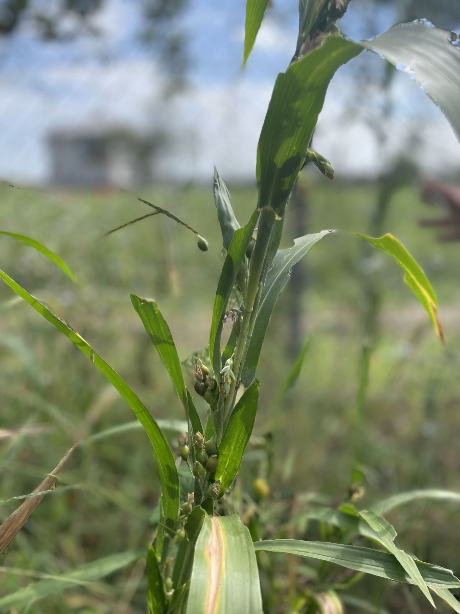 水辺に生育する大型のイネ科植物の一種です。東南アジア原産。郊外の水辺などに生える野草で、草丈1~2mほどになります。実は硬くて光沢があり、私が小学生の頃は、これでアクセサリーを作ったりして遊んでいました。