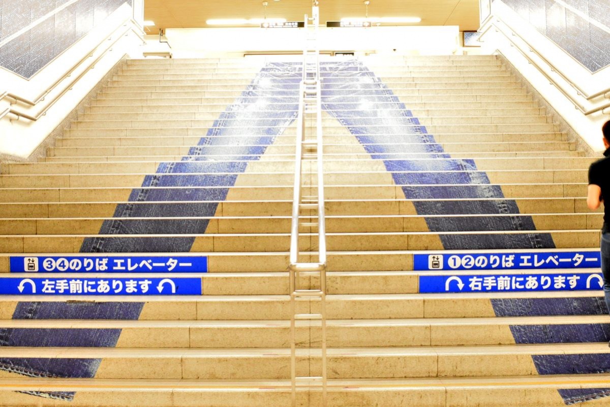 7.駅階段に巨大ジーンズ!?(倉敷市/JR児島駅構内)