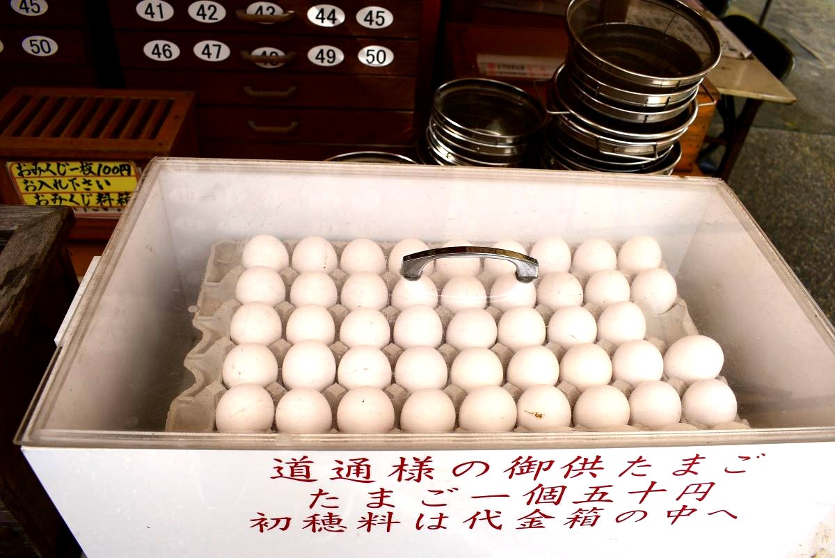 神社の境内で玉子の販売!?道通さまのお使いの白ヘビ・巳様(みーさま)の好物「生卵」をお供えするという、岡山県南部の道通信仰を体験することができる貴重な神社ですよ。