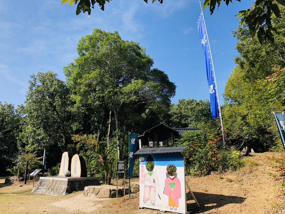 天文13年(1544)浦上宗景に仕えていた宇喜多直家が初陣で赤松晴政との戦いで戦功をあげ、三百貫の所領と30人の足軽を与えられ、児島湾への睨みの利くこの地に築城した。直家スタートの城じゃ。遺構は曲輪などが残っている。 写真のモニュメントの回りの30個の石は与えられた足軽を表しておるんじゃ。
