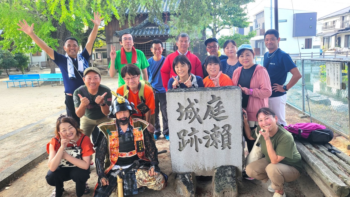 岡山駅に集合ののち、スタート地点の乙子城に車に分乗して到着。するとサプライズで宇喜多直家、宇喜多秀家、明石掃部が参加者をお出迎え。ツアー参加者も突然甲冑武者が現れてビックリ!