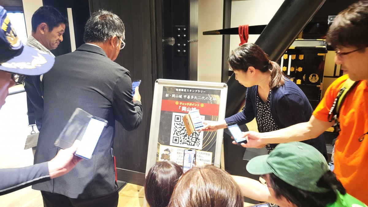 こちらゴールの10スポット目の岡山城もQRコードを読み込むスポットじゃった。 岡山城にも朝、乙子城で参加者を出迎えた宇喜多秀家、明石埽部と、岡山戦国武将隊サポーターの子供武者・ばんり君がゴールでも待っておった。QRコードは天守閣内の1階にあった。