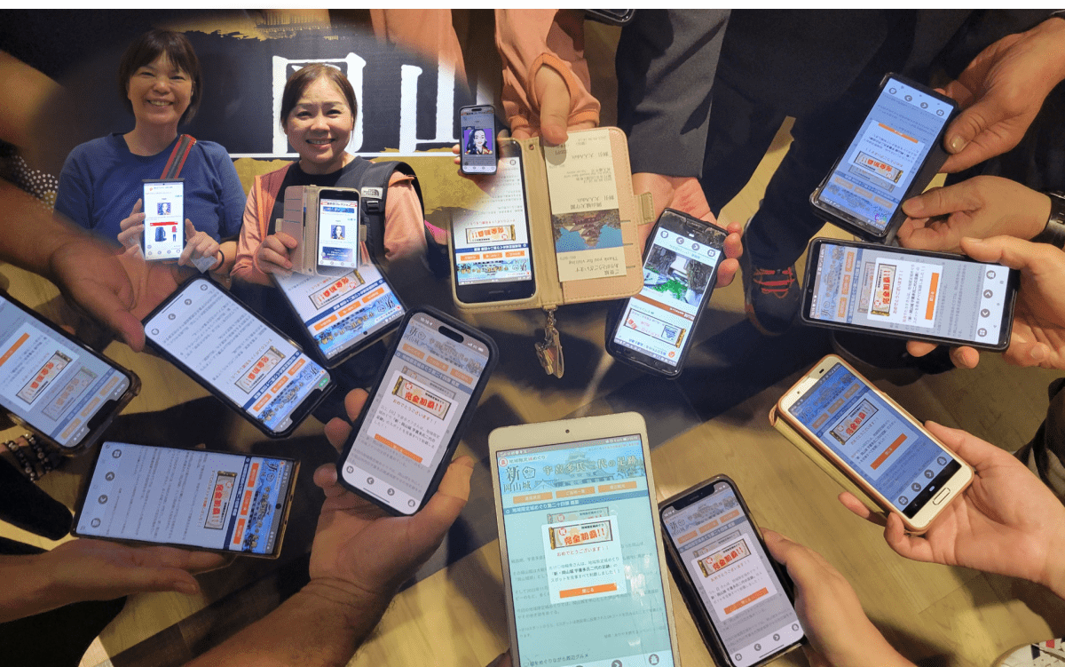 このイベントは、ニッポン城めぐりというゲームアプリ(日本中のお城3,000城を網羅しており、GPSを使ってそれぞれのお城を攻略していくというもの。3,000城コンプリートしている猛者も大勢すでにおるらしい)を使い、宇喜多関連の岡山市内10箇所のスポットを回り攻略していくもので、コンプリートするとアプリの中で使える限定の姫がもらえるというものじゃ。アプリユーザーはこの限定の姫がほしいんじゃな。今回は宇喜多直家の妻であり、岡山城初代城主宇喜多秀家の母でもある(おふく)円融院がもらえるんじゃ。