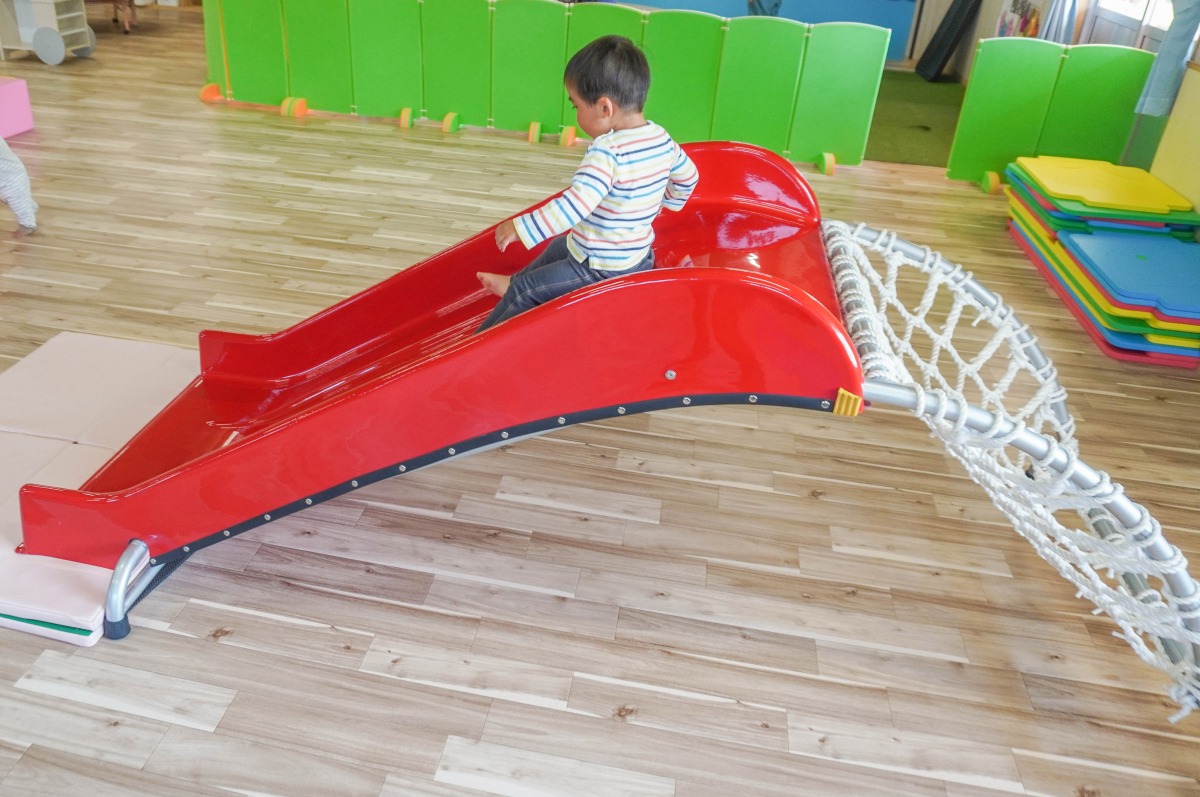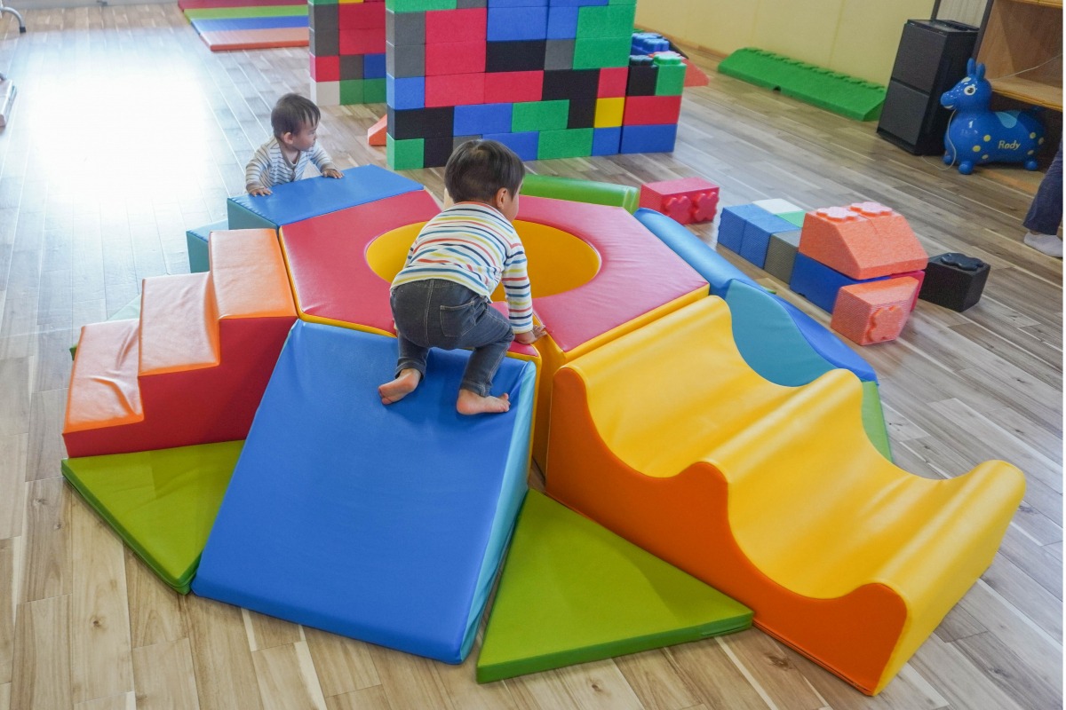 柔らかいから転んでも安心。滑ったり、でこぼこのブロックを歩いたりして遊びます。