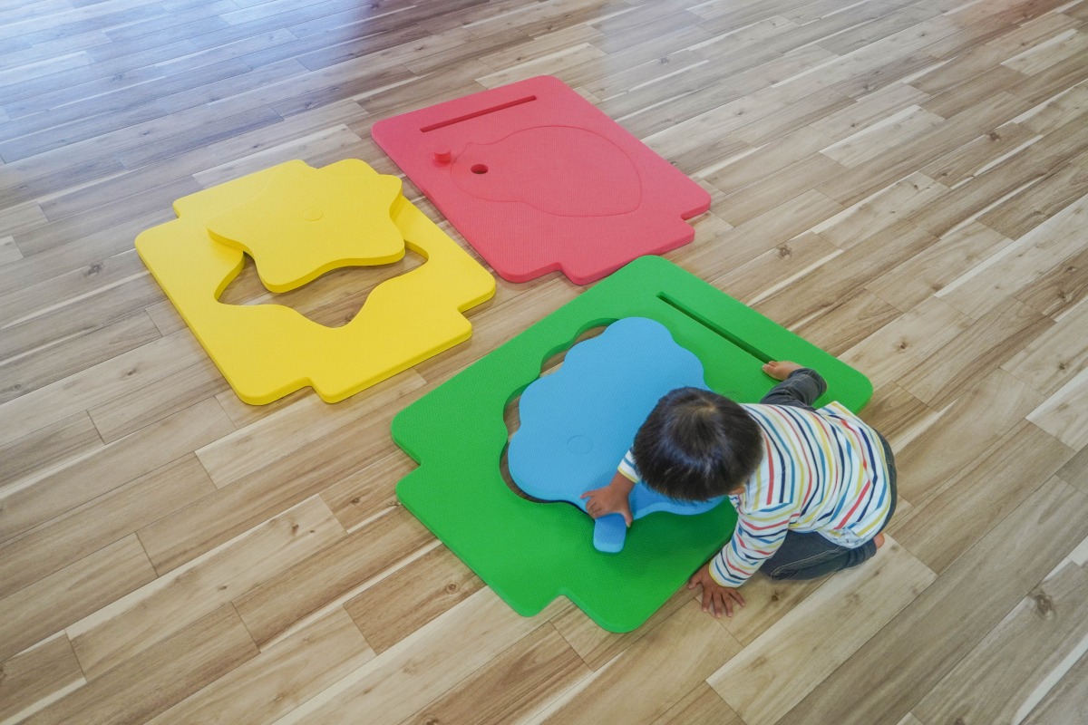パズルのように形を合わせて遊びます。普通のパズルは難しいけど、大きいパズルなら何とか形を合わせられます。