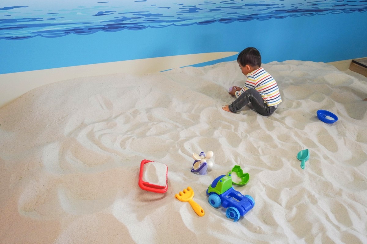 屋内にある砂場です。砂に石や水が混じったりして汚れることがないのでサラサラです。