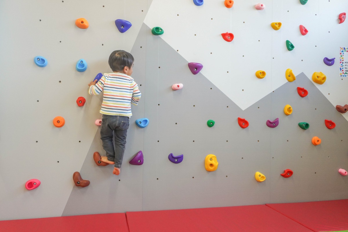 壁の突起を使って登って遊びます。子ども用のボルダリングの遊具は珍しい!
