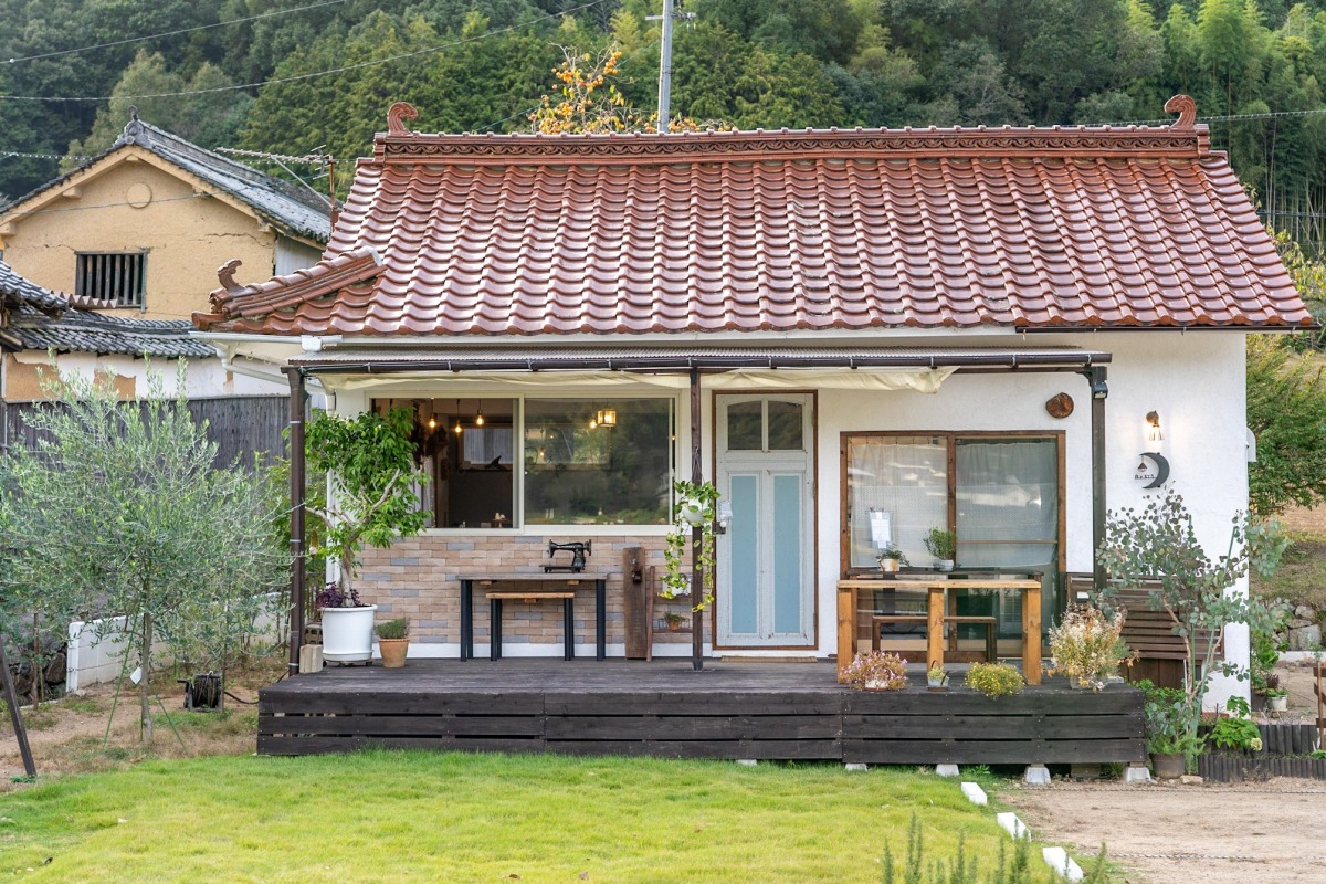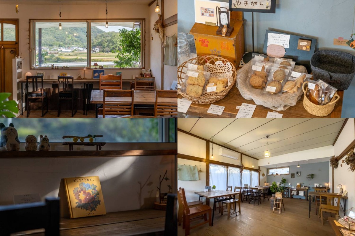 窓の外にのどかな里山風景を望む、山あいの古民家カフェ。店主が好きだという月や灯りモチーフの雑貨が飾られた店内には、ゆるやかで心地いい空気が漂っています。