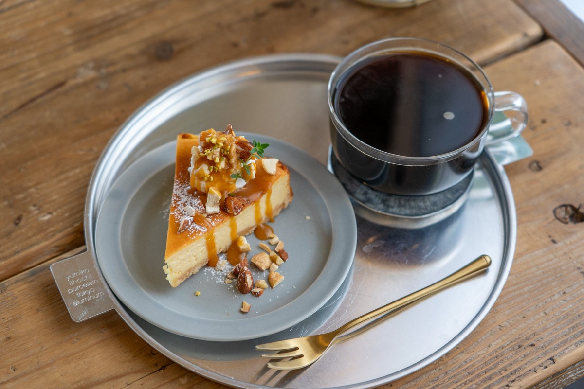 体に優しい素材で作るケーキや果物を使ったスイーツは季節ごとに様々な種類が登場。写真は自家製キャラメルソースとナッツをかけた濃厚な味わいの「キャラメルナッツのチーズケーキ」。オリジナルブレンドのコーヒーとも相性ぴったりです。焼菓子とドリンクはテイクアウトも可能。
