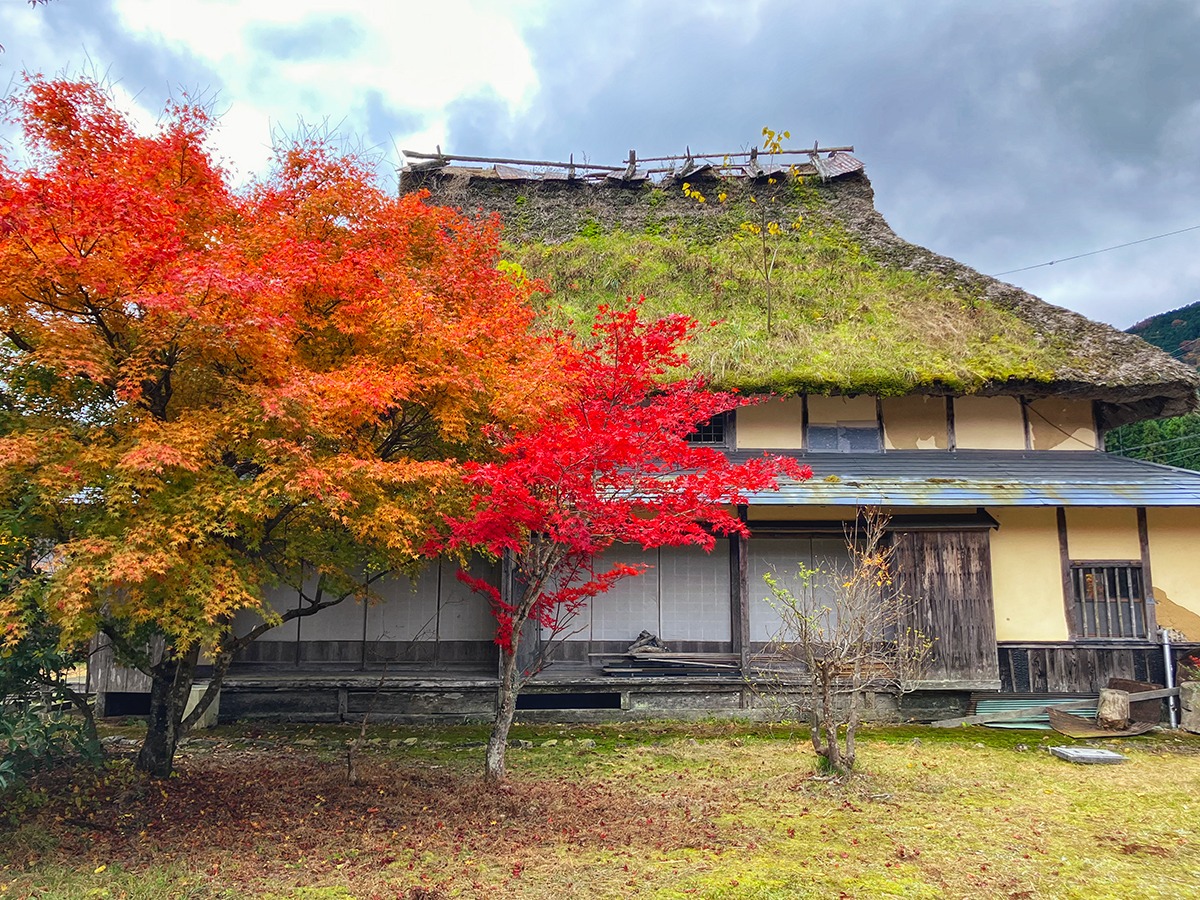 茅葺の日本家屋と赤く色づいたモミジの組み合わせが侘び寂びを醸し出します。