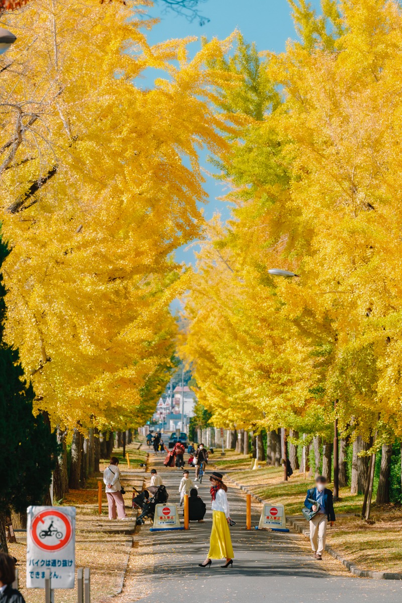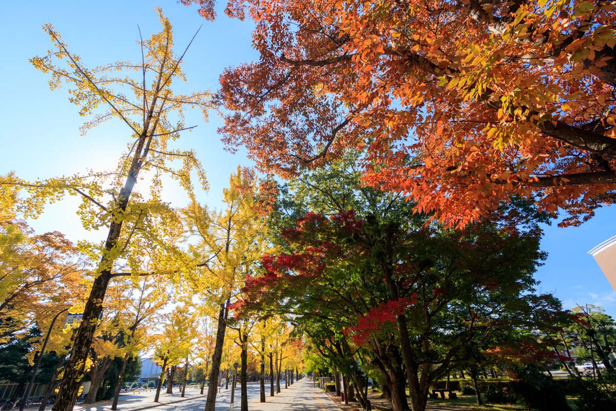 大学構内だけでなく、キャンパスの間を通る公道にも約50本のいちょうの木が並んでいます。