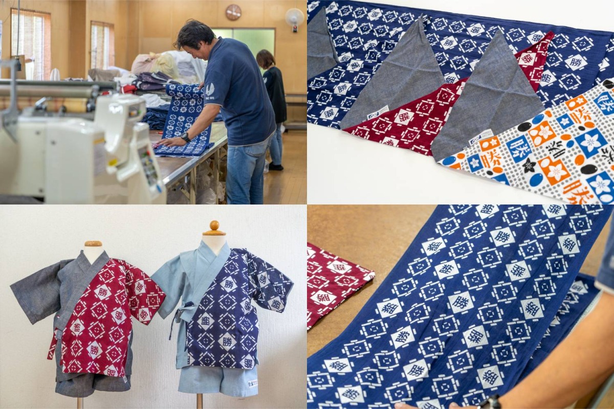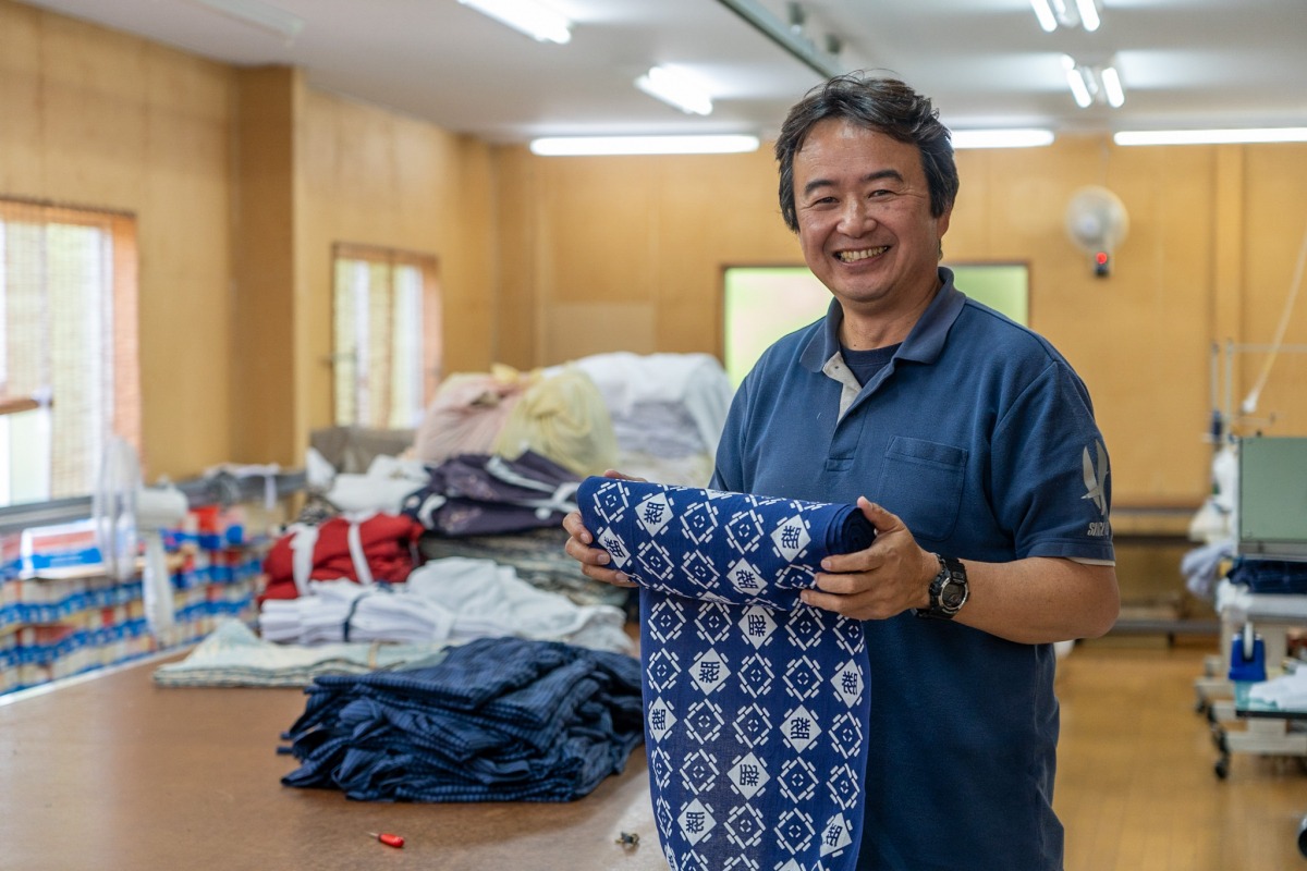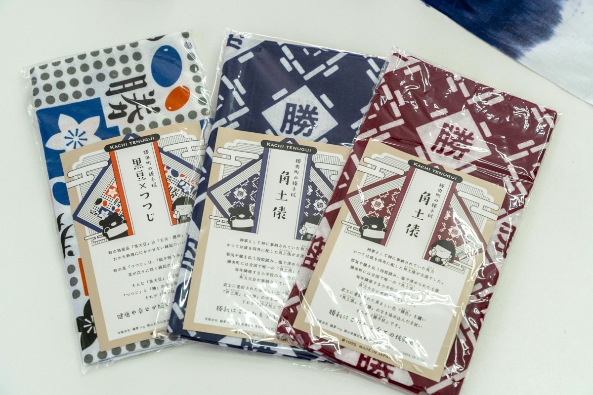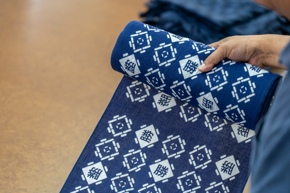 「長年培ってきた和装縫製の技術を使って、地元に貢献できるものを作りたい」と話す、代表の岡本新吾さん。縁起を担ぎ“勝”を願う縁起物をモチーフの図柄を「勝紋」と名付け、町の魅力発信の一助を担っています。