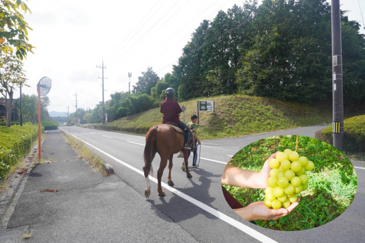 馬に乗ってシャインマスカットを収穫しに行ける縁起体験「ウマス勝ット(ウマスカット)ぶどうトレッキング」。なんと公道上を馬で移動できます。乗馬経験がない人でも、スタッフが先導してくれるので安心です。ぶどう畑に着いたら自分が選んだ実を収穫できるのも嬉しい! 収穫する楽しみ、食べる喜び、動物とのふれあいが一度に楽しめます。