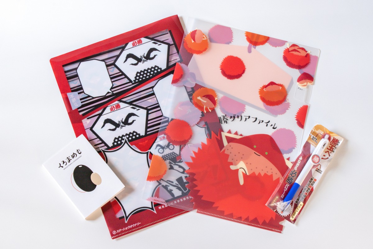 「合格」と「互角」をかけたキャラクター・熱血栗佐衛が強インパクトな「合格リアファイル」、落下防止ストッパー付き「勝グリアファイル」、マメにメモして受験に勝つ!特産の黒大豆が可愛い「くろまめも」、カチ!カチ!カチ!と3回ノックして必勝パワーを凝縮する「勝玉(かちボール)ペン」の、“勝”にこだわった受験生のための縁起文房具。