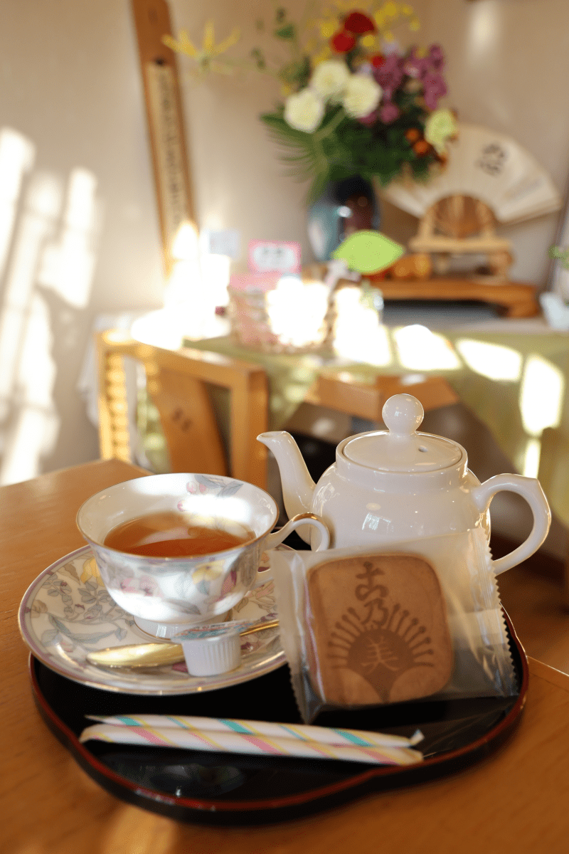 帰り際に、参拝者休憩所「和(なごみ)」に寄って美味しい紅茶と梅ジュースと梅の甘露煮を頂きました。季節のお花が飾ってあり、コスモスのタペストリーがあったりして、境内同様に気持ちの良い気が流れていました。境内で採れる梅を煮詰めて作られた梅の甘露煮はとても美味しかったです。梅ジュースもさっぱりとした甘さで美味しかったです。参拝の帰りにぜひ立ち寄ってみてください。