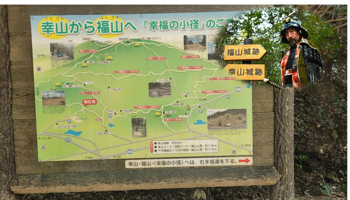 総社市の南部に幸山城(こうざんじょう)と福山城(ふくやまじょう)という山城がある。この二つの城を含めたハイキングコースが整備されておるんじゃが、読んで字のごとく「幸福」じゃ!