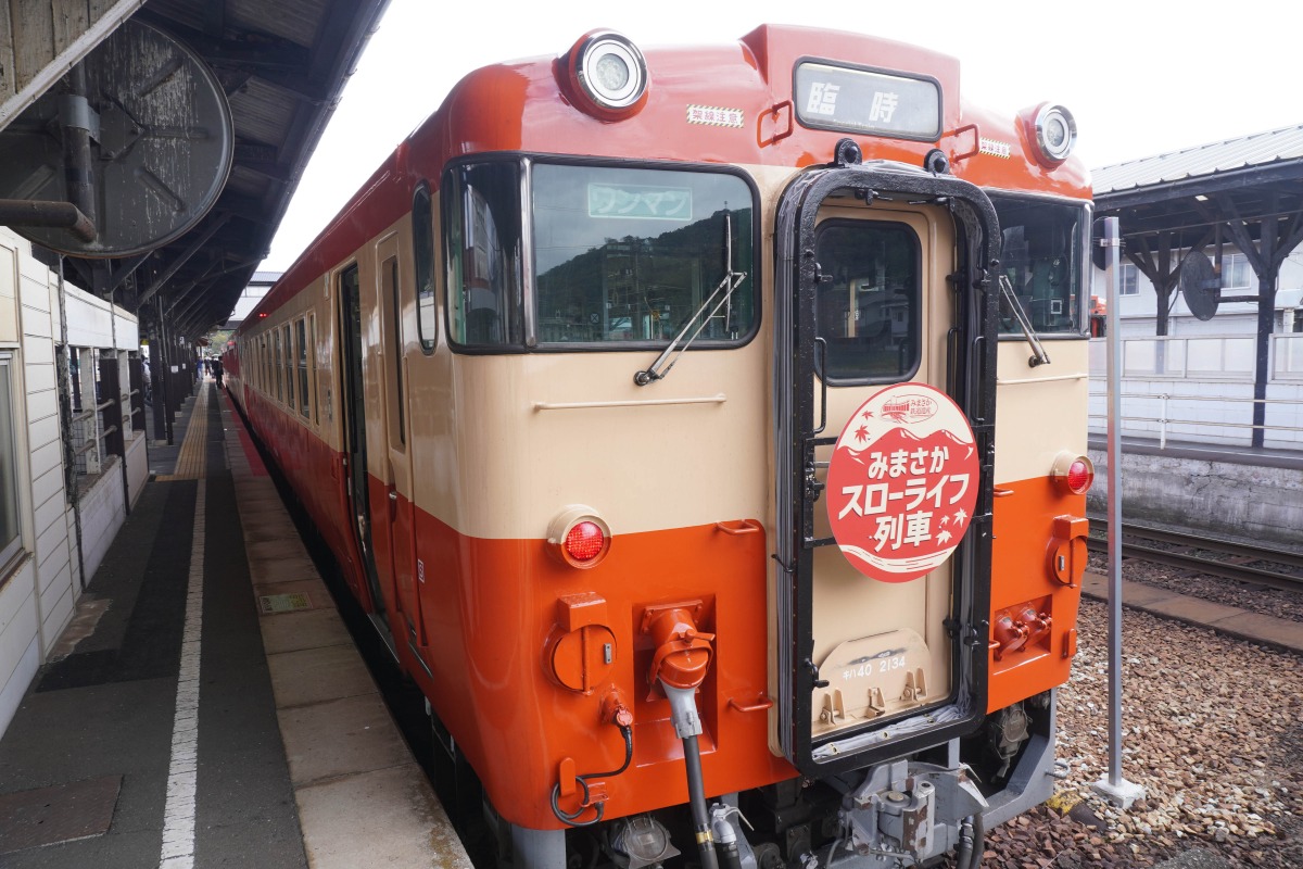 スローライフ列車の旅は、オレンジとクリーム色の車体が目を惹くこの列車。