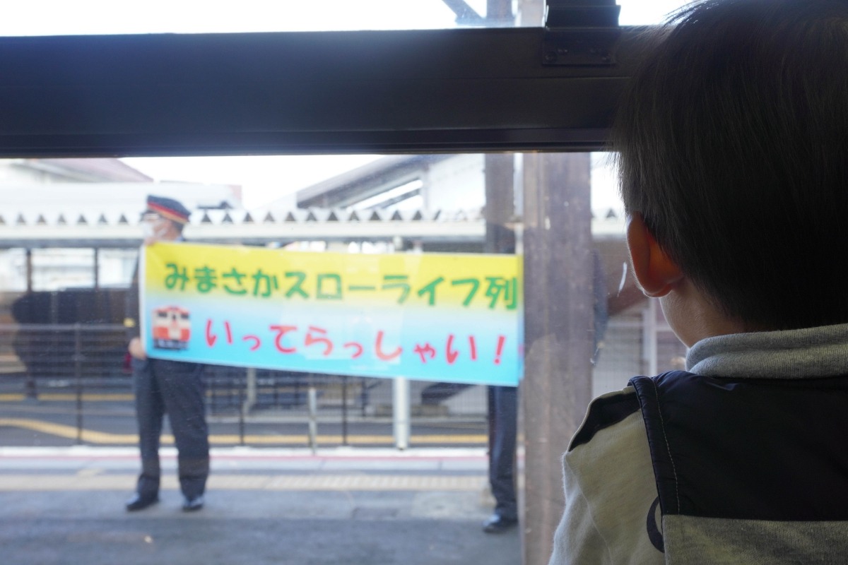 スローライフ列車の旅は津山駅から始まります。ホームには、出発を待つ3両編成の列車。出発前からたくさんの乗客の皆さんが記念撮影をしていました。全席指定なので、席取りの心配がなく安心です。駅員さんに見送られつつ出発。
