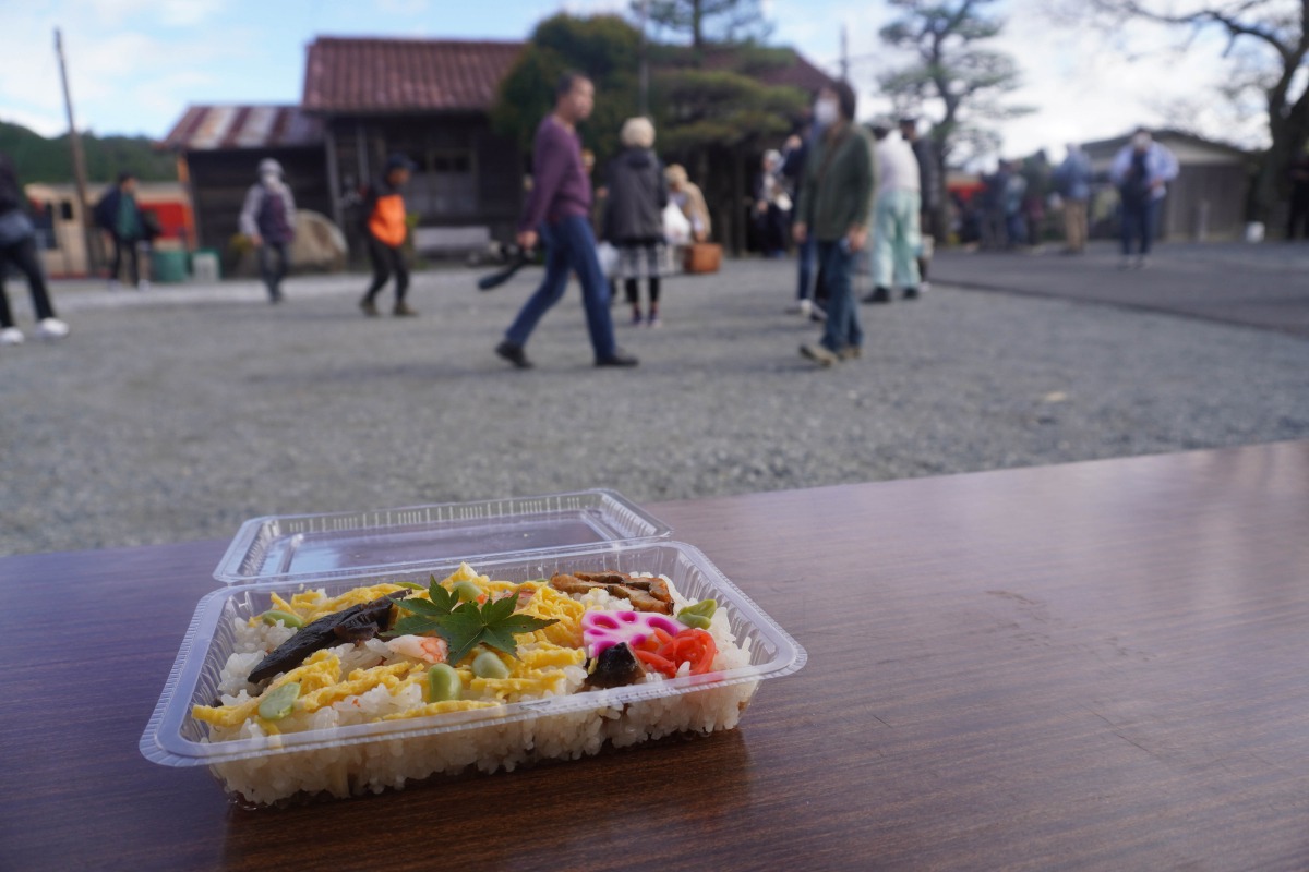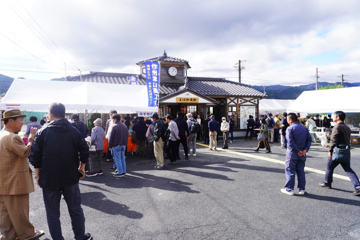 この駅で最初の地元の方のおもてなし。地域の特産品や列車グッズの販売、ちらし寿司も販売されていました。