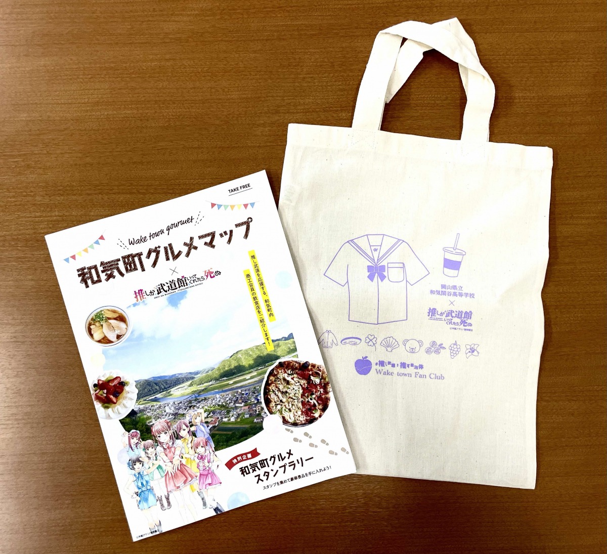 和気町内の飲食店などを巡る「推し武道」コラボのグルメスタンプラリーも絶賛開催中。期間中にスタンプを2個集めると、「推し武道×和気町コラボ」のオリジナルデザイントートバッグがもらえます(先着1,000名)。