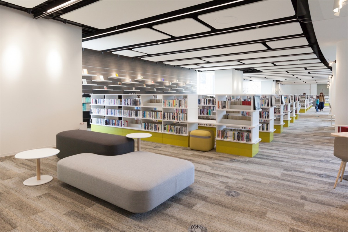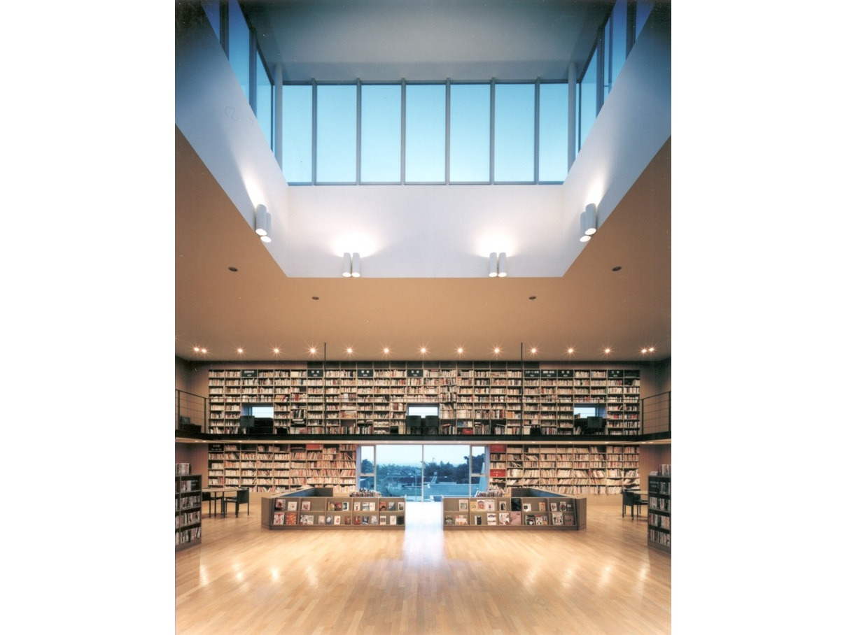 四方を書架に囲まれた空間は中心部分が吹き抜けになっており、上部の窓から自然光を取り込んだ明るく開放的な雰囲気。書架の間には小窓付きの閲覧席が設けられていて、町の風景や自然を望むことができます。