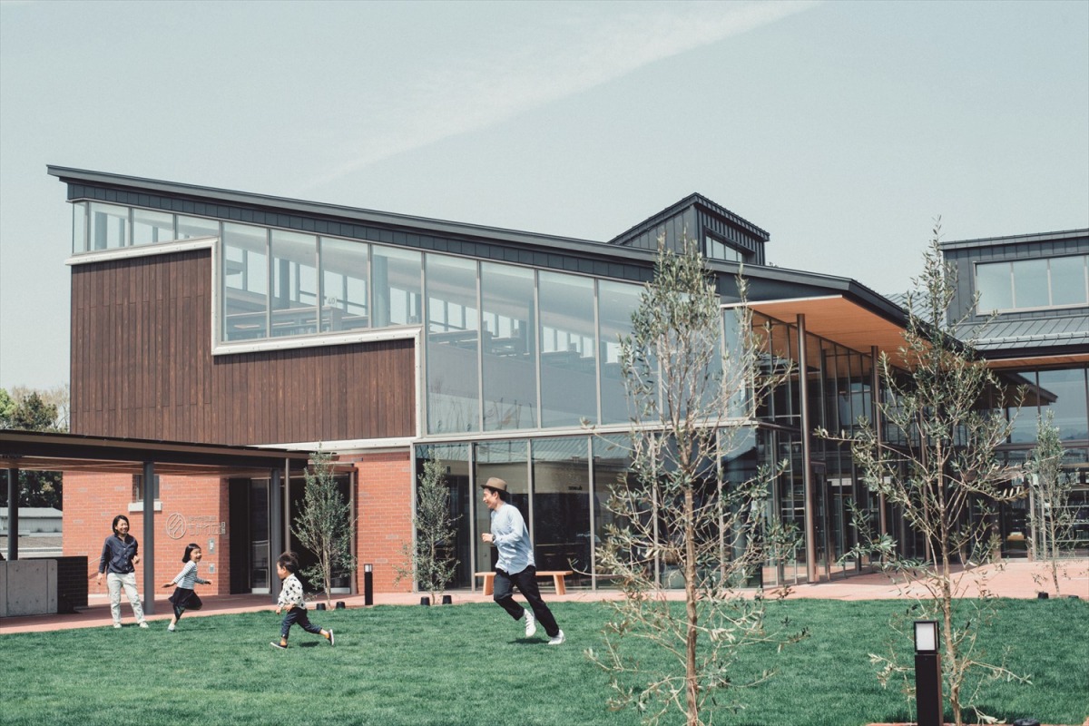 隣にある赤レンガの中央公民館と市民図書館の共通の庭である「オリーブの庭」。本を読んだりお弁当を食べたりできる、1年を通して緑が生える芝生の広場では、思い思いに過ごすことができます。