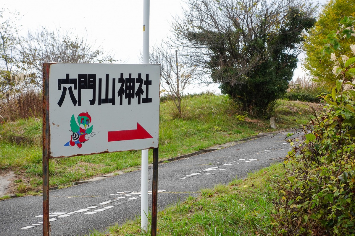 穴門山神社へは、県道77号を通り、高梁市川上町の弥高山を越えて(高梁市市街地方面からの場合)進みます。道沿いの右手に、小さな案内板が見えてきます。