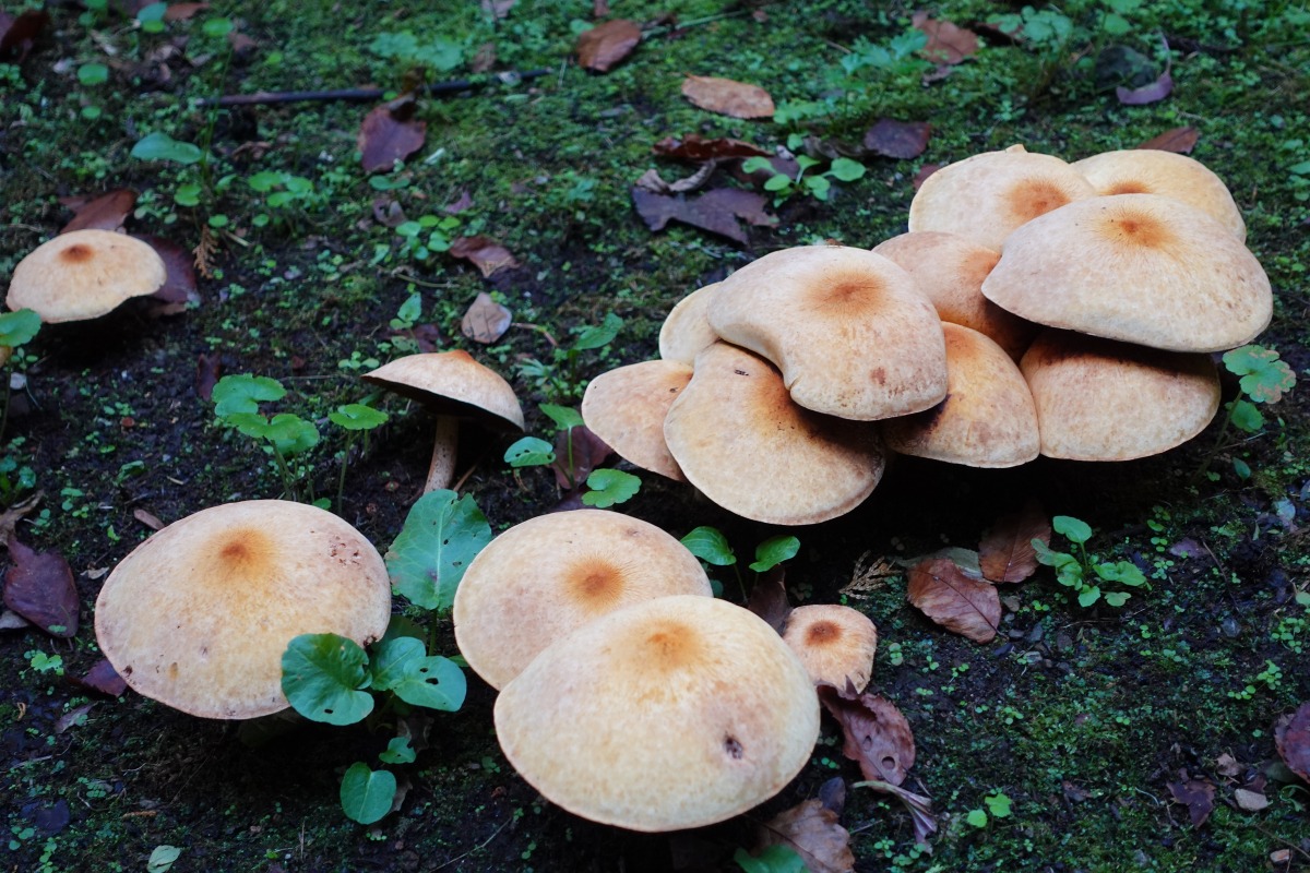 光が届きにくく、しっとりした空気が満ちて、植物やきのこたちが生い茂っています。静寂な雰囲気に包まれた参道に少し広い場所があり、(ここが駐車場です)左手に小さな橋が見えてきました。