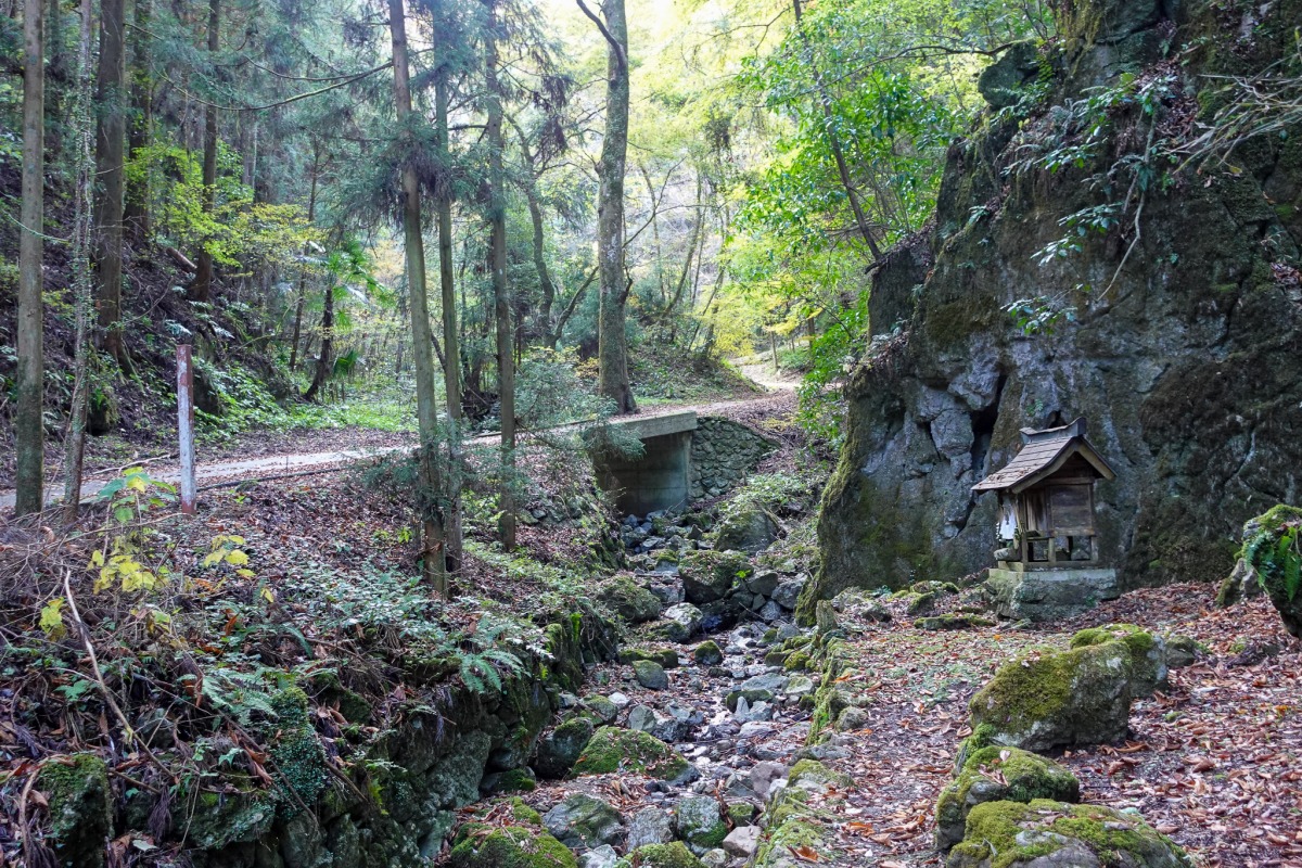このあたりは石灰岩ですが、小さな祠の奥に小さな穴があり、そこにはしめなわが張られています。