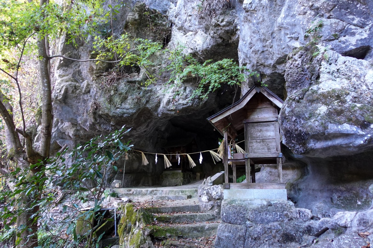静かな森をドキドキしながら進むと、そこには平安時代からあるという、神秘的な神社と御神窟が!