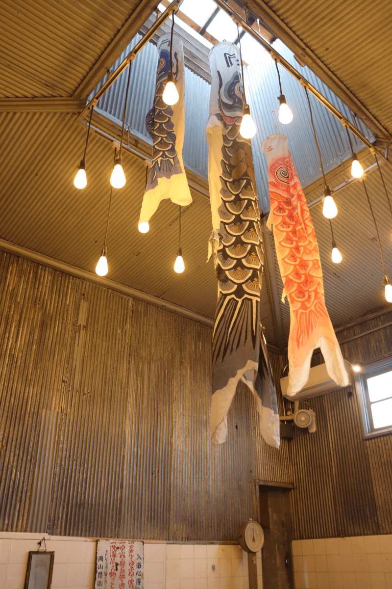 昔の銭湯の湯気を喚起する天窓には、大きなこいのぼりとおしゃれな照明が絶妙のバランスで収まっていました。高い天井に落ち着く照明、注文して待っている間も楽しい気分になりました。