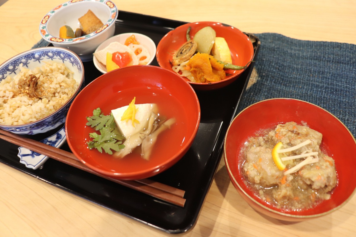 津山産玄米の生姜ご飯、津山産味噌のお味噌汁、津山産生姜と津山産黒豚のお団子、季節のお野菜のお煮つけなど、生姜料理を主にした美味しい薬膳メニューが揃っています。