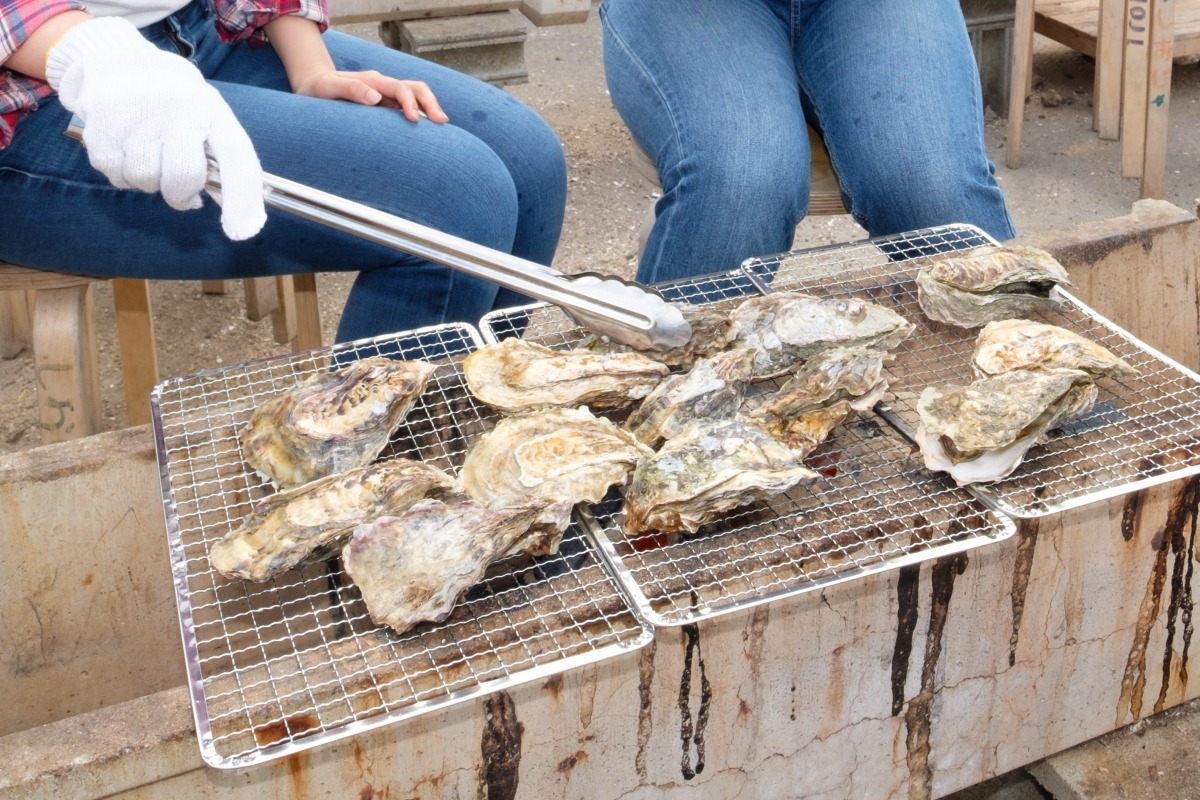 炭焼きで牡蠣が味わえる牡蠣小屋も営業。面倒な準備や後片付けはお任せで、道の駅と敷地内の店舗で購入した牡蠣を持ち込んでその場で焼いて食べられるようになりました。