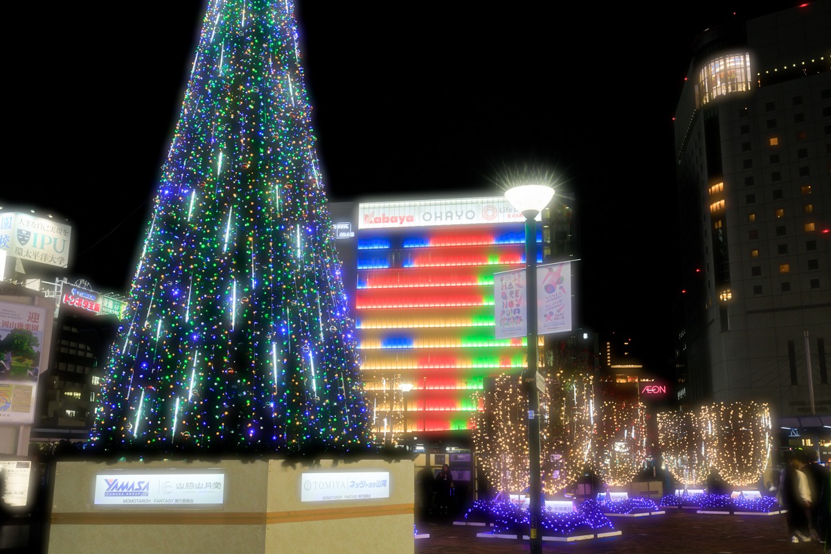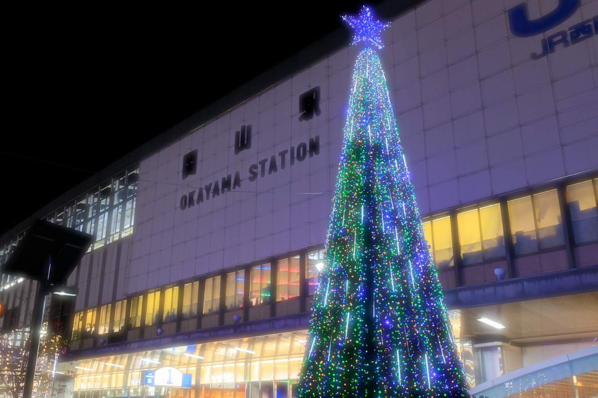 JR岡山駅東口を出るとすぐ、大きなクリスマスツリーが迎えてくれます。
