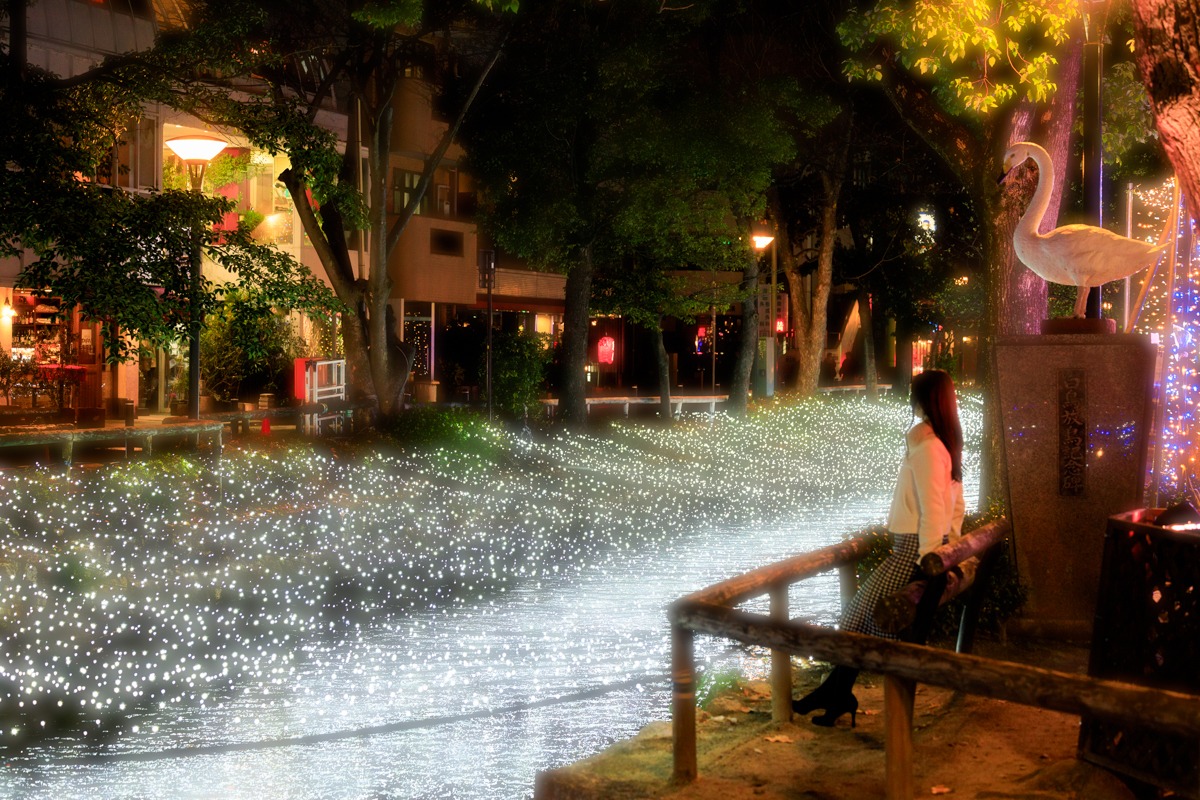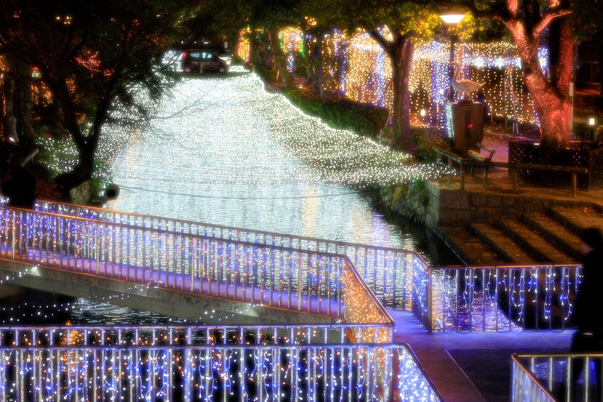 約24万球の電球で煌びやかに彩られる、川沿いを歩いてみましょう。