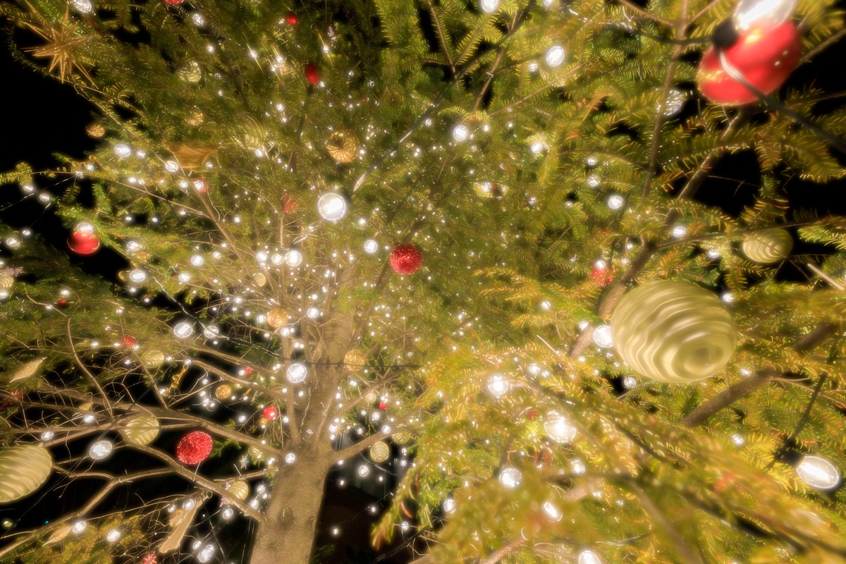 下からツリーを見上げると、たくさんのオーナメントや電球が幻想的で美しい!