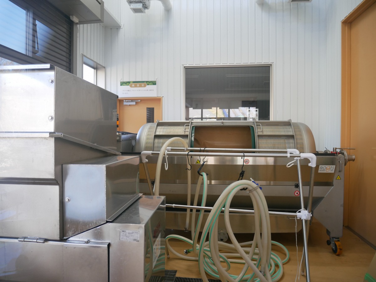 正面にある機械は搾汁機です。メンブランと呼ばれる風船のようなものを低圧で膨らませて、果汁を優しく搾っていきます。