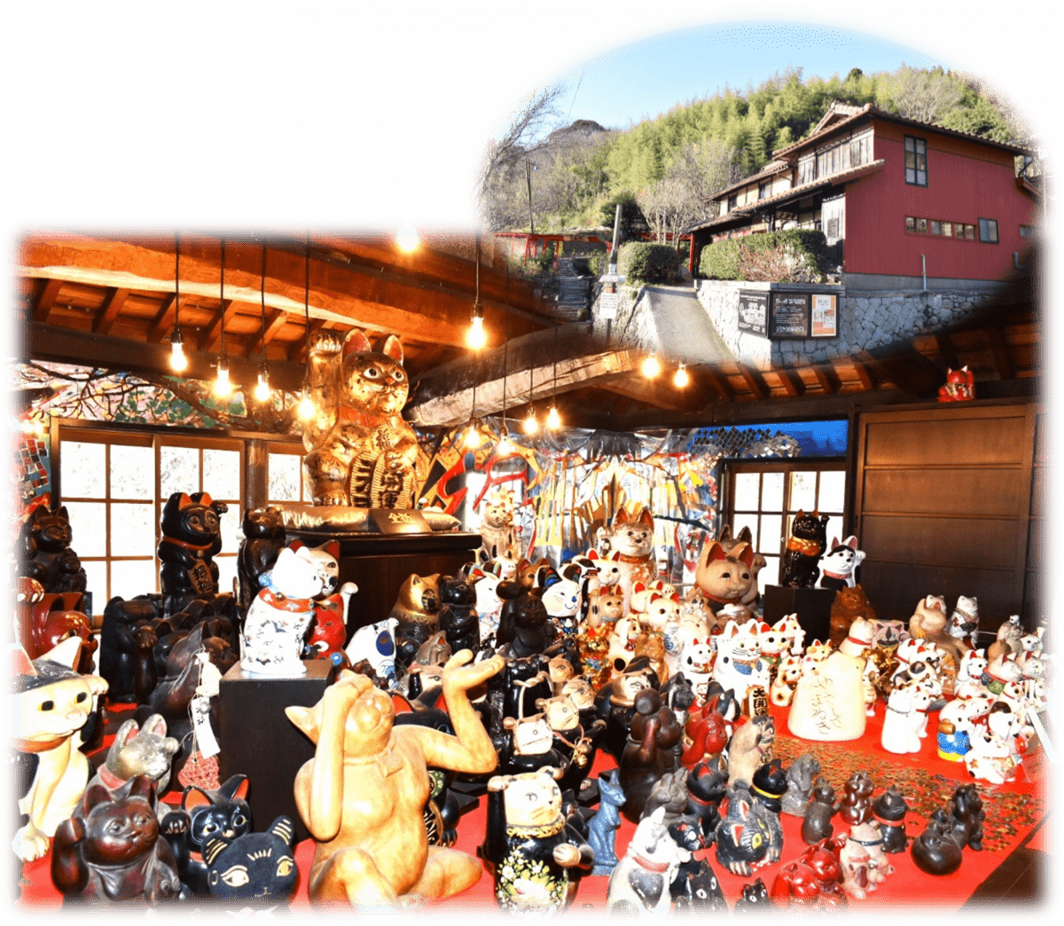 古今東西の招き猫が約800体展示されており、とてもユニークな珍しい美術館として人気なんじゃ。金山寺との共通拝観割引券もある。金山寺の復興事業にも協力されており、招き猫の御守や御朱印帳などのとっても可愛いグッズの売上げが全て金山寺のために積み立てられておる。