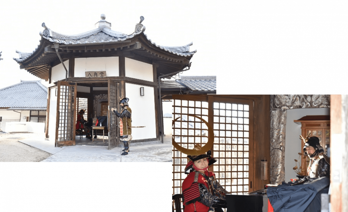 本堂奥に八角堂がある。餘慶寺を開いた報恩大師をまつるお堂で、内部にはなんとグランドピアノが置かれておる。「お寺deピアノ」と名付けられておって、誰でも弾けるストリートピアノならぬテンプルピアノじゃ。びっくりしたが、なんと秀家様、席に着くや否や演奏を始められ、妙音を奉納されておった。