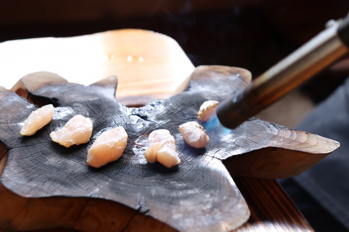 新鮮なササミをかいづかの木の上で、目の前でバーナーで炙りたてを、ワサビ醤油で頂けます。もともと岡山市で「炭焼き 鯉乃群」をされていて、鶏肉が美味しいのはお墨付きです。