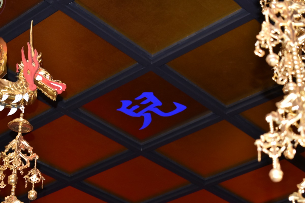 この天井画は、前のビル内本堂にあったものを、そのまま移しているそうじゃ。その中には宇喜多の旗印である「児」の字が青白く浮かび上がっておった。正面には御本尊の阿弥陀如来像が祀られておる。