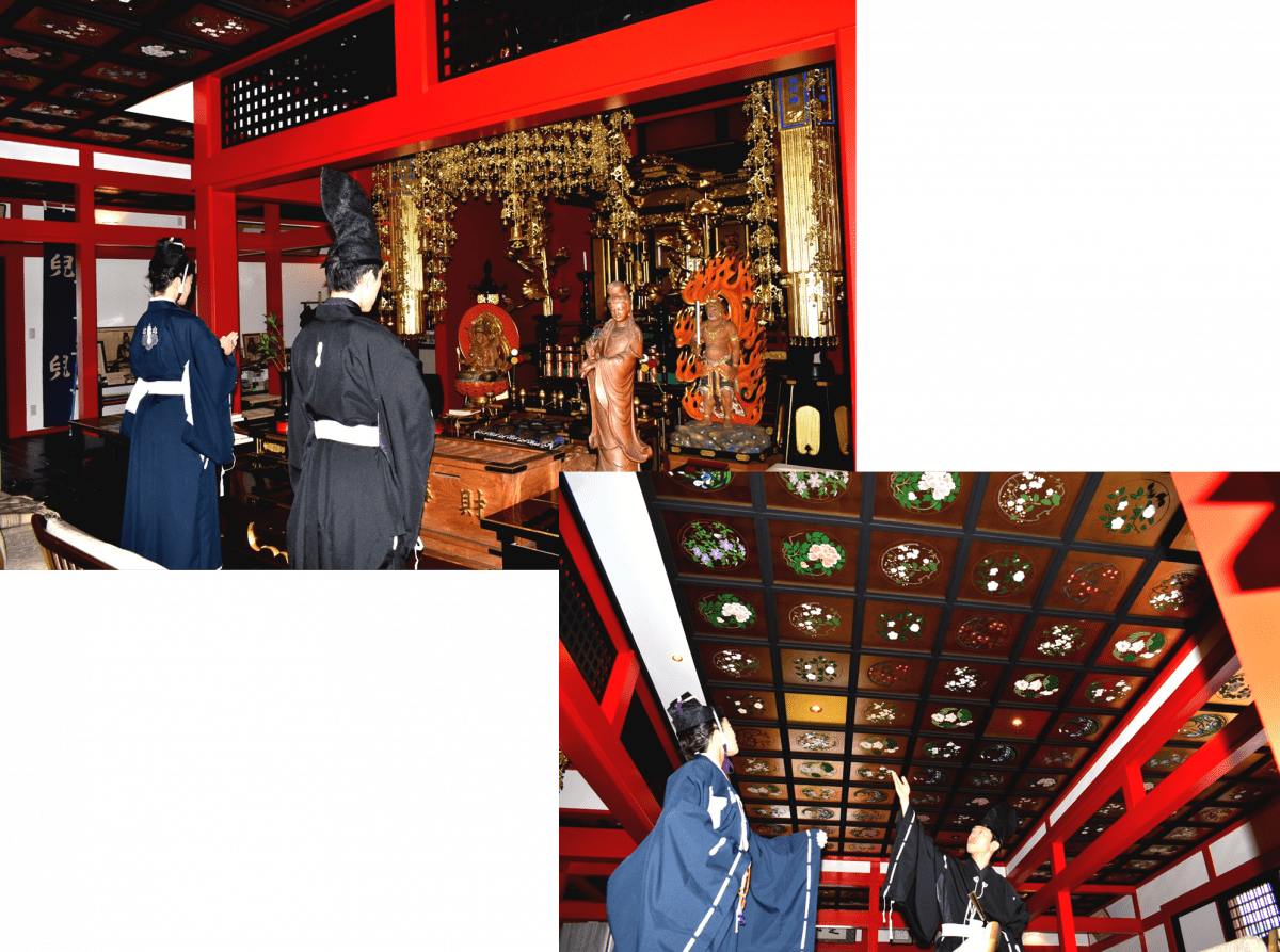 新しくなった新本堂をご案内しよう。本堂は木造平屋建て。外観と同じく内部も朱塗りの柱が映える。そして目をひくのが天井一面に貼られた金箔地に描かれた天井画。とても豪華じゃ。