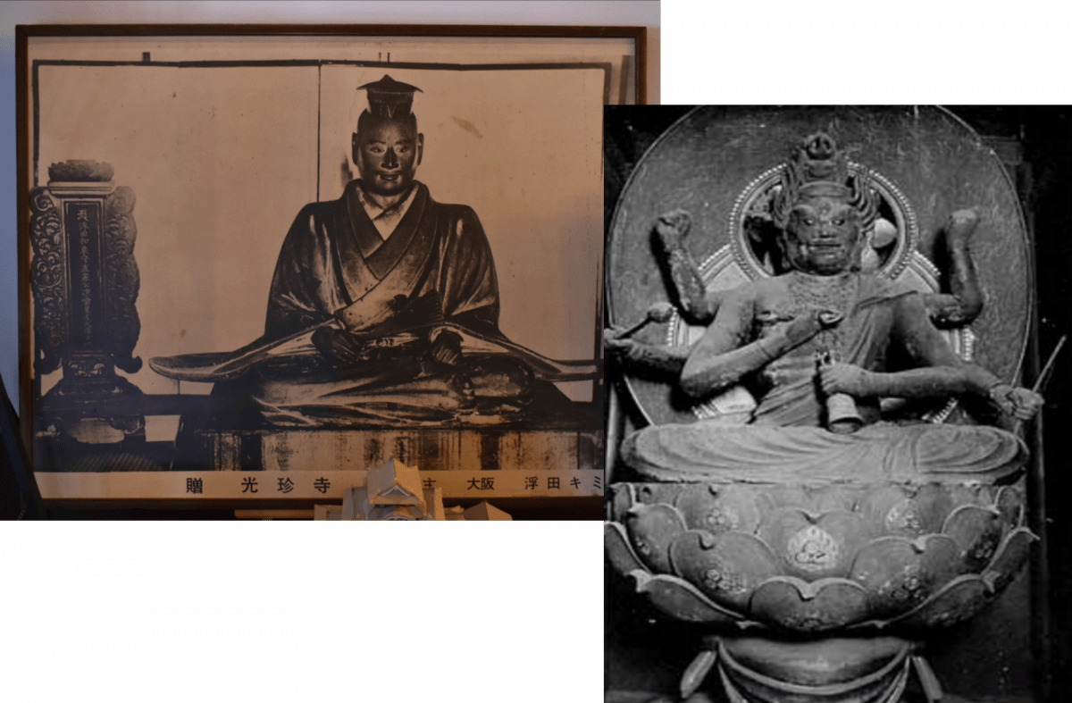 その近くには焼失した宇喜多直家の木像の写真が飾られておる。木像は焼失したが、写真が残っていたため直家の姿を垣間見ることができるんじゃ。実はこの写真を参考にして彩色された木像が復元されておるんじゃ。「光珍寺」から岡山市に寄贈されて、現在は岡山城天守内に展示されている。こちらも合わせてご覧になってくだされ。